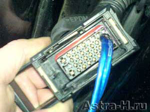 Проложен кабель питание от аккумулятора до усилителя в багажника, акустические провода в передние двери. Чтобы проложить акустический провод пришлось высверлить отверстие в разъемах дверей, что хорошо видно на фото.
