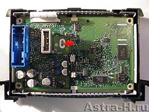 После снятия дисплея как описано в раздлеле "Сверчки" центральной консоли Опель Астра Н, можно приступать к его разборке. Для этого отвинчиваем 4 шурупа, положение которых показано стрелками.